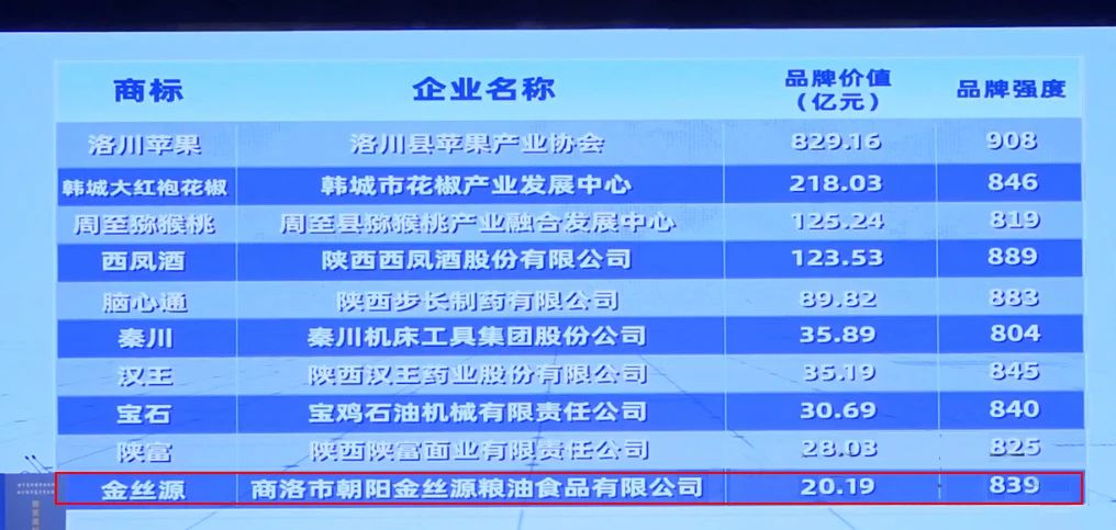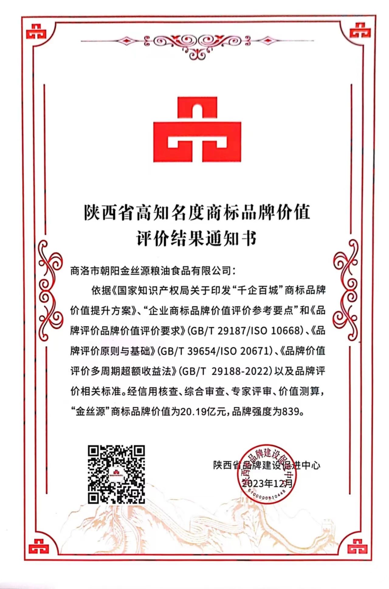 ? ? ? 近日,2023年陜西省商標(biāo)品牌發(fā)展大會在寶雞市舉行,商洛市朝陽集團“金絲源”商標(biāo)經(jīng)陜西省品牌建設(shè)促進中心相關(guān)專家的評審,“金絲源”商標(biāo)位居高知名度商標(biāo)品牌榜第10位,品牌價值20.19億元,品牌強度839,充分體現(xiàn)了“金絲源”在商標(biāo)品牌建設(shè)方面取得的突出成就和影響力!