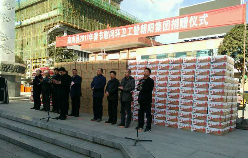 ??2017年1月13日上午,冬日的暖陽高照,商南縣政府廣場上熱鬧非凡。商洛市朝陽集團(tuán)公司在此舉行慰問捐贈活動,由商南縣委、政府、政協(xié)、城管局等部門牽頭主持,朝陽集團(tuán)公司下屬的運(yùn)通公司、雨力潔公司、金絲源糧油公司等分公司聯(lián)合為全縣390名環(huán)衛(wèi)工發(fā)放了米、油、水果等春節(jié)慰問品,環(huán)衛(wèi)工與參與活動的領(lǐng)導(dǎo)和群眾們一致對此表示熱烈的感謝,感謝朝陽集團(tuán)十幾年如一日的堅(jiān)持,對辛勤工作在一線的環(huán)衛(wèi)工們的慰問和關(guān)心。? ? ??